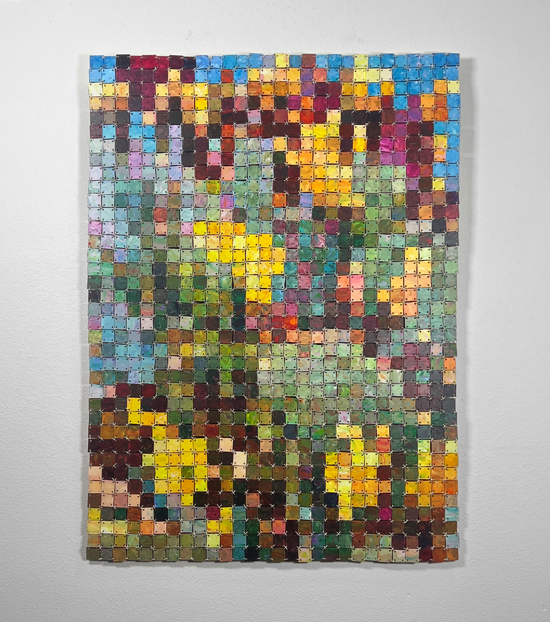 This vibrant, handcrafted mixed media cactus assemblage evokes the rugged beauty of the desert landscape, meticulously constructed from individual hand-painted squares and metal fasteners. The resulting textured surface bursts with desert hues, forming a dynamic and three-dimensional wall sculpture. This modern artwork's mosaic-like construction adds depth and dimension, creating a visually stunning effect, making it a true conversation starter and a captivating addition to any contemporary art collection.